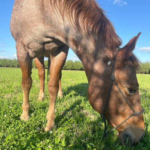 Slingshot, a red roan quarter horse mare of the age 24. Sling, known for spunky personality in her younger years, has been by my side for the past 21 years. Sling is a gentle soul with a heart of gold, always ready with a soft nicker and a nuzzle for those who need comfort. Her calm and patient demeanor offers great compassion in providing individual’s space to safely process their feelings.